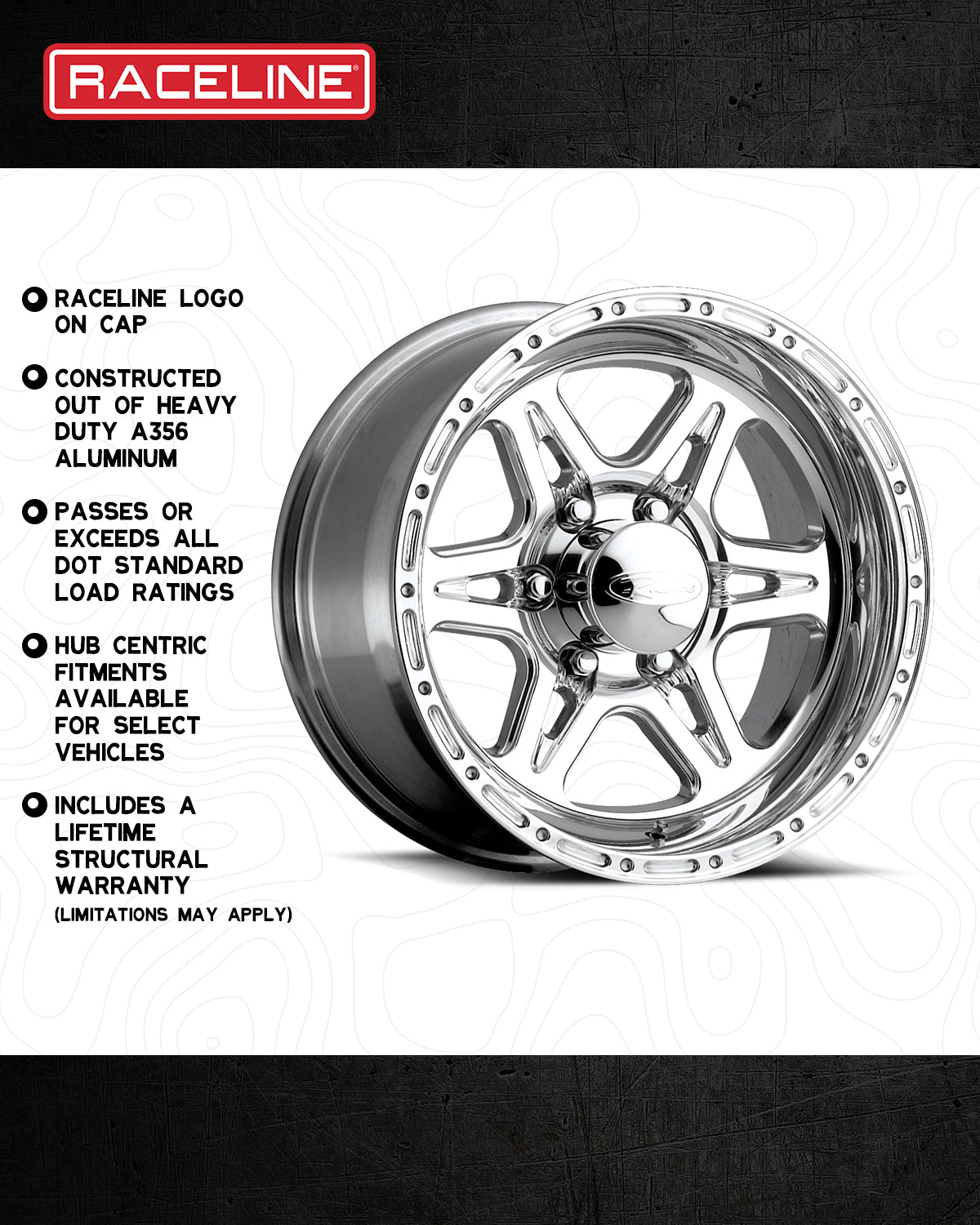 - • Push thru cap with contrasting embossed Raceline logo