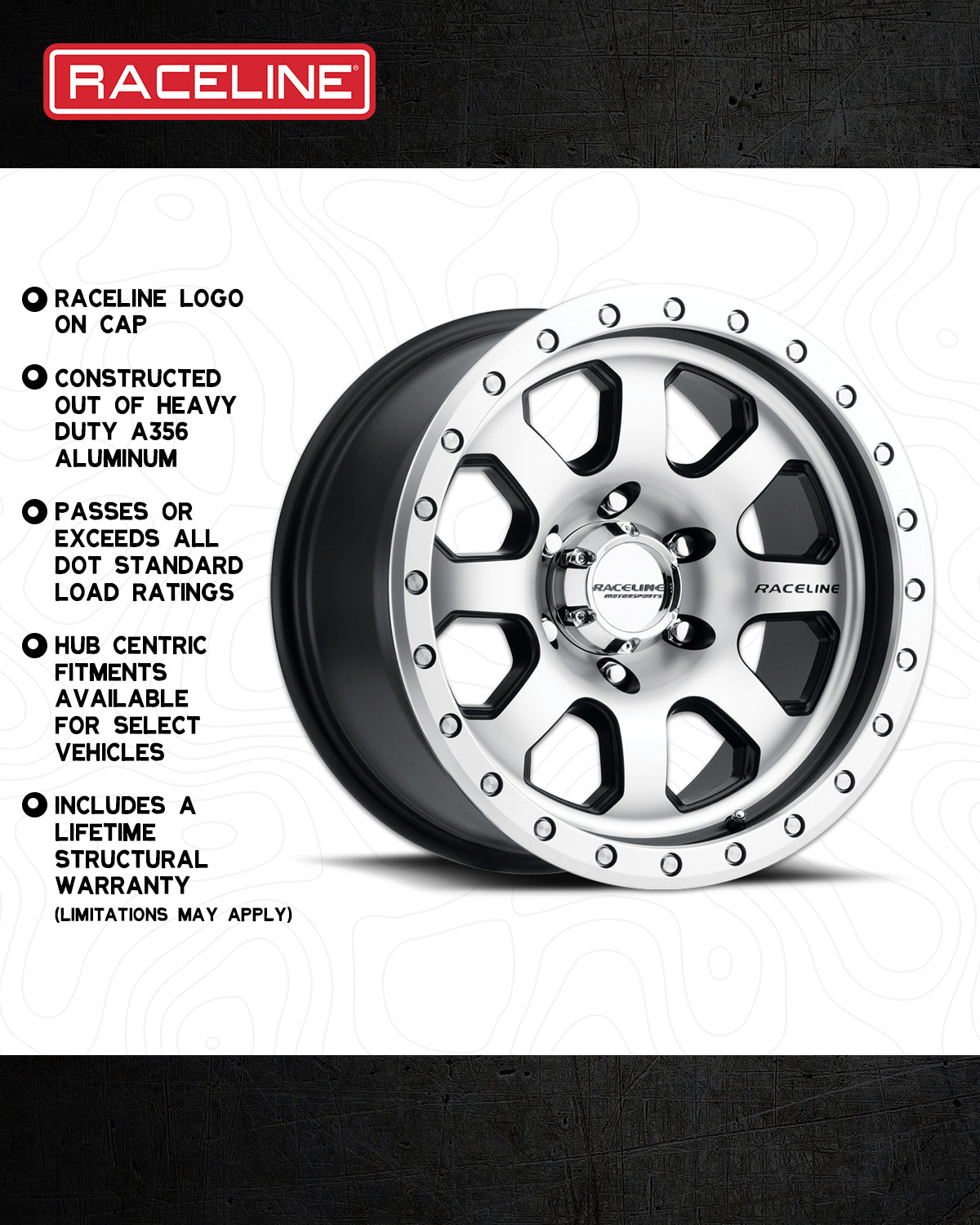 - • Classic 8 spoke design with a cast in debossed Raceline logo, the street version of the legendary Avenger Beadlock