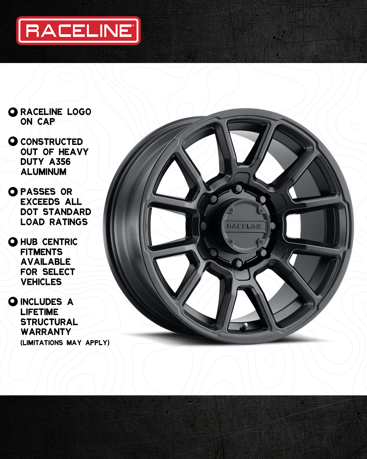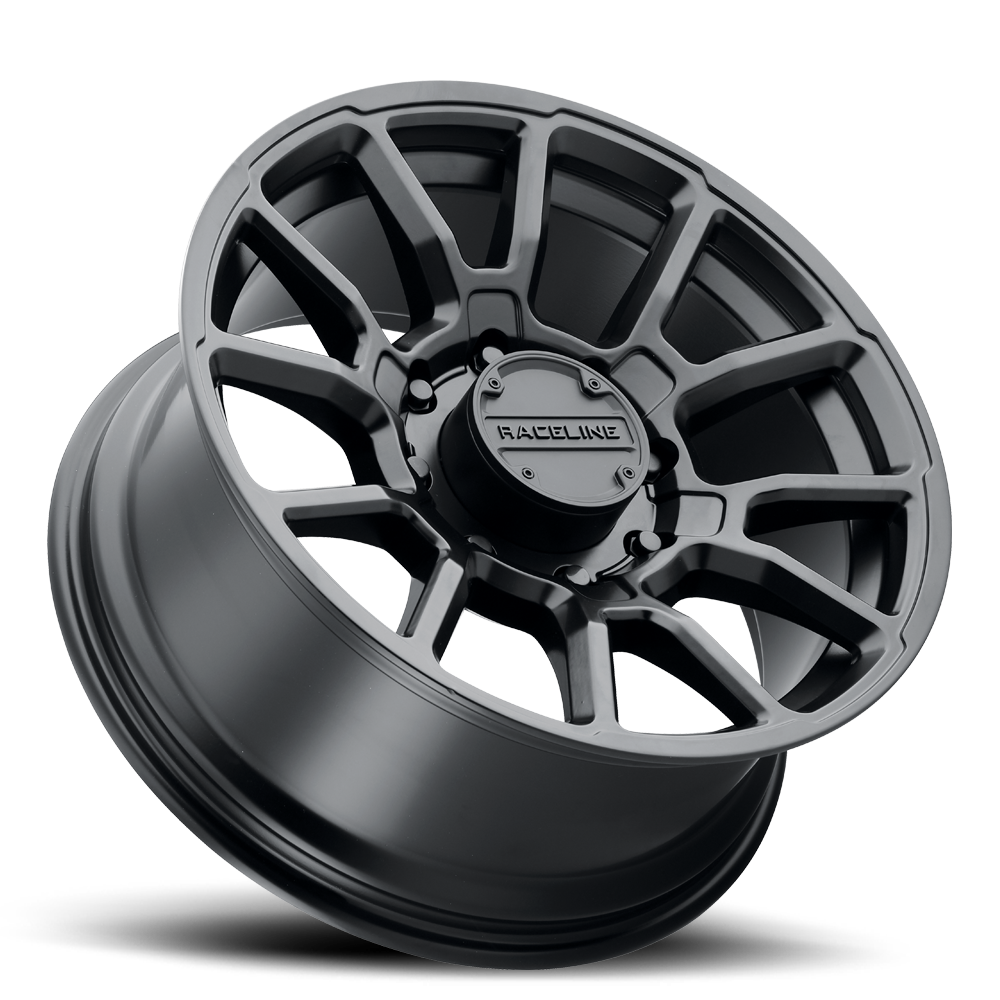 • Black Out snap in cap with contrasting embossed Raceline logo Push thru cap for 8 lug applications