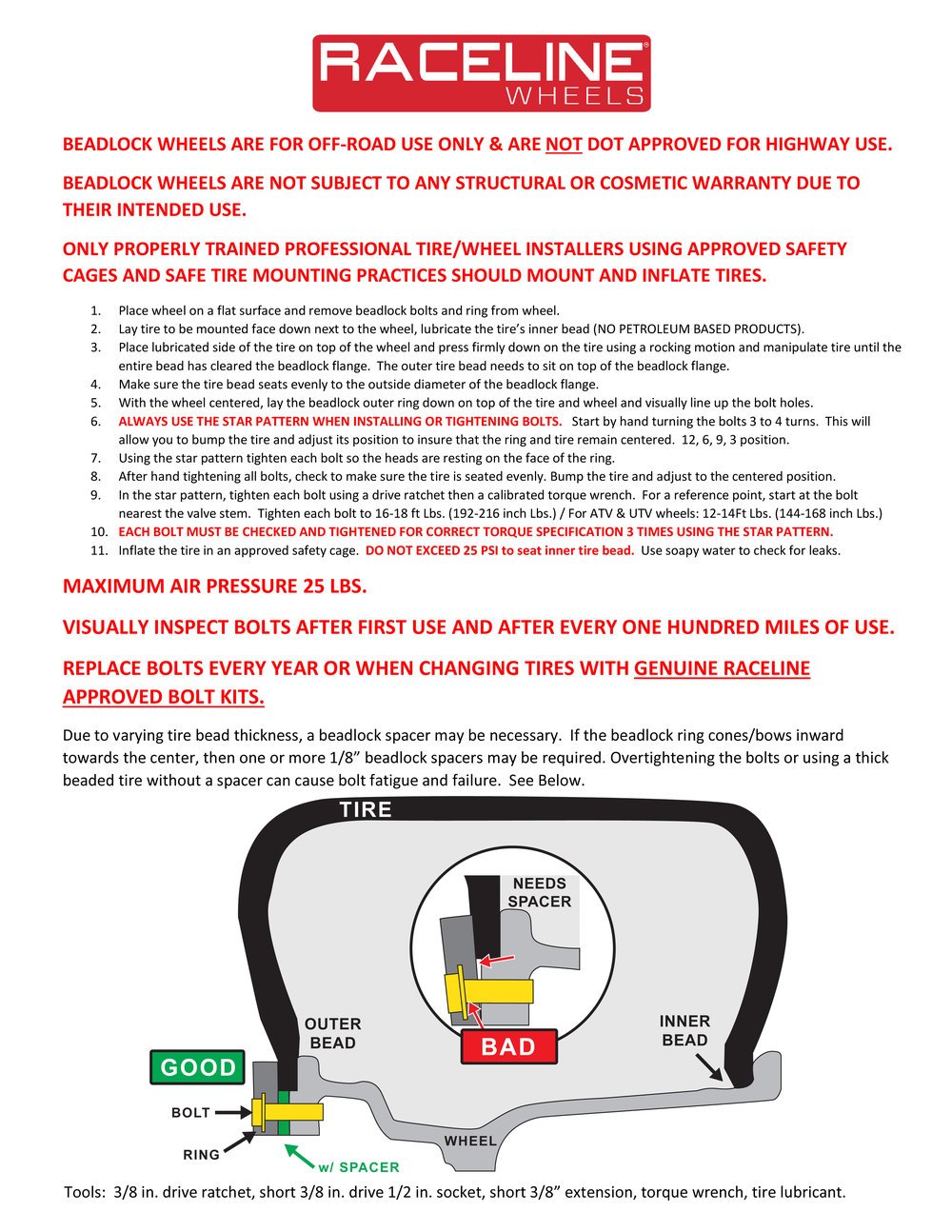 • For thicker beaded tires, Raceline beadlock ring spacers are available to ensure proper ring seating.